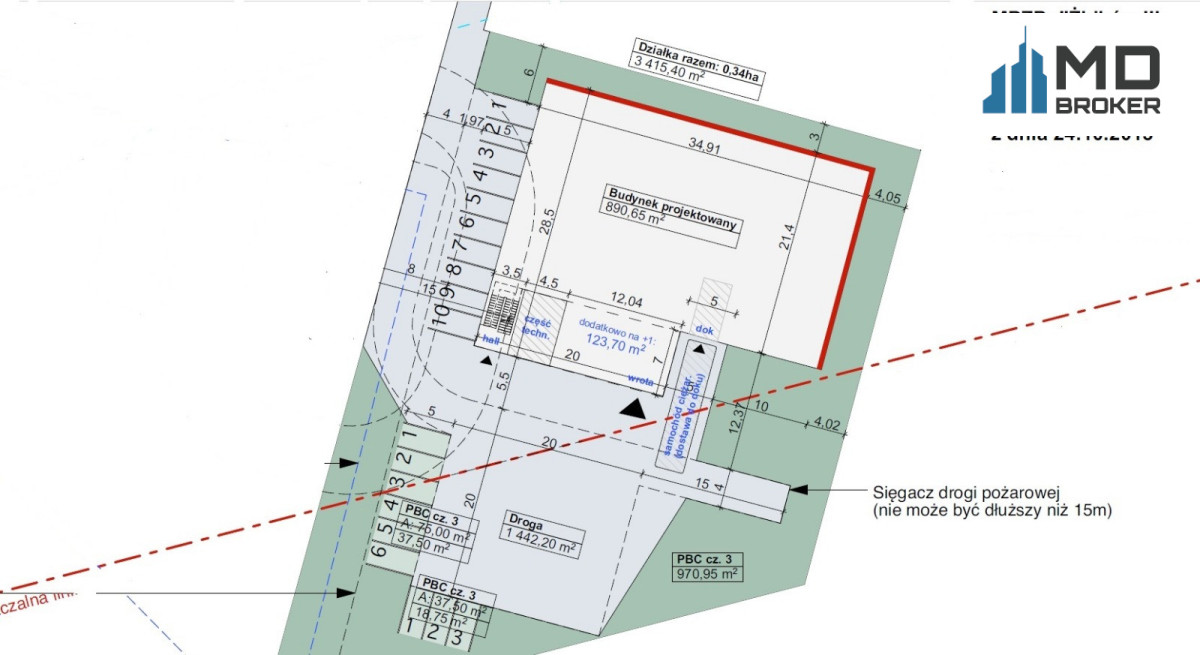 Dla działki przygotowana została analiza, która wskazuje możliwość wybudowania hali magazynowej o powierzchni ok. 850 m2 - możliwość wykonania DOKu rozładunkowego oraz bram z poziomu „0”.