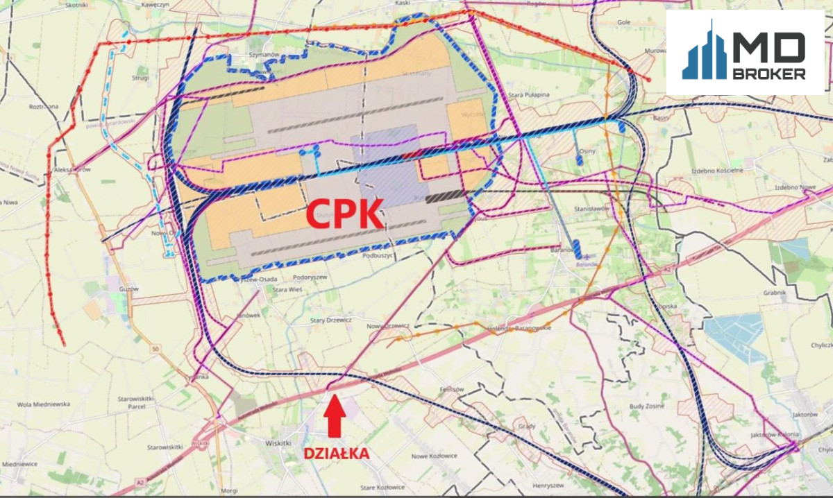 Na sprzedaż grunt inwestycyjny niezabudowany o powierzchni 32693 m2 położony w części inwestycyjnej gminy Wiskitki (powiat żyrardowski) w pobliżu węzła komunikacyjnego autostrady A2 i drogi krajowej DK50 oraz w bezpośrednim sąsiedztwie CPK.