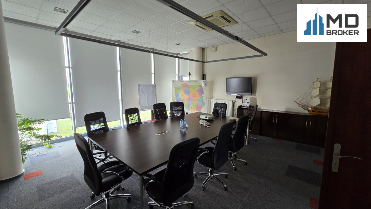 The office and social section is constructed with reinforced concrete, except for the exhibition hall, which is built with a steel structure. On the ground floor of the office building, there is a reception area, an exhibition hall (285.3 m²) with a set of toilets (including one for disabled persons), a meeting room, sales department offices, and a kitchenette. The upper floor contains office rooms, a kitchenette, and a set of toilets. From the hallway on the upper floor, there is access to a terrace located on the roof above the social area. Vertical communication is provided by a staircase.