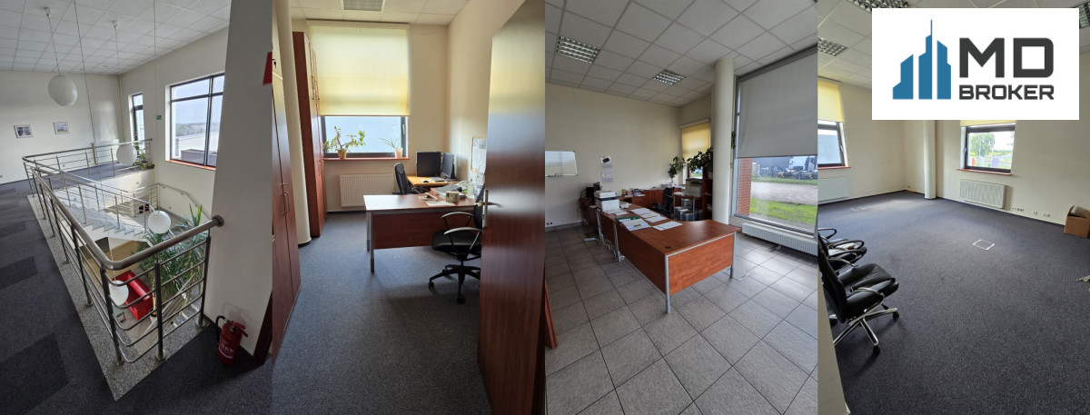 The property features a location near the S7 route and is in close proximity to both the Modlin Airport and the capital city. The plot includes a two-story office building with a total area of 801 m² and a modern warehouse with an area of 2240 m².